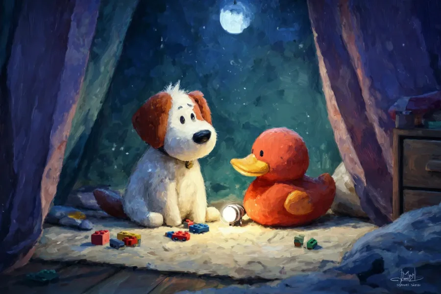 Ця вечірня казка розповідає про іграшки, які оживають, коли в кімнаті стає тихо й темно. У центрі історії — плюшевий Пес і гумове Каченя, які щоночі виходять на патруль, дбаючи…