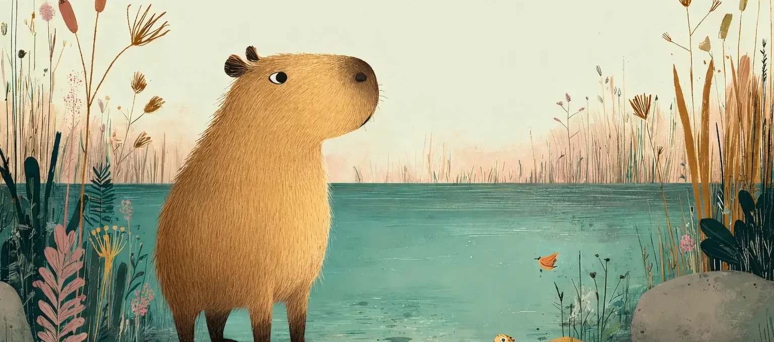 Одного ранку капібара прокинулася раніше, ніж зазвичай, і пішла до свого улюбленого озера. Вона любила починати день біля води — слухати, як річка тихо рухається, і дивитися, як сонце торкається поверхні.