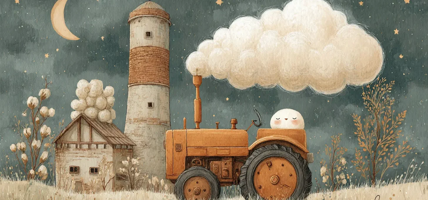 Тракторець повільно їхав полем, а хмаринка пливла над ним, тримаючись за мотузочку. Вони рухалися неквапливо, майже мовчки. Іноді хмаринка трохи піднімалася, іноді знову опускалася, але кожного разу їй ставало легше.